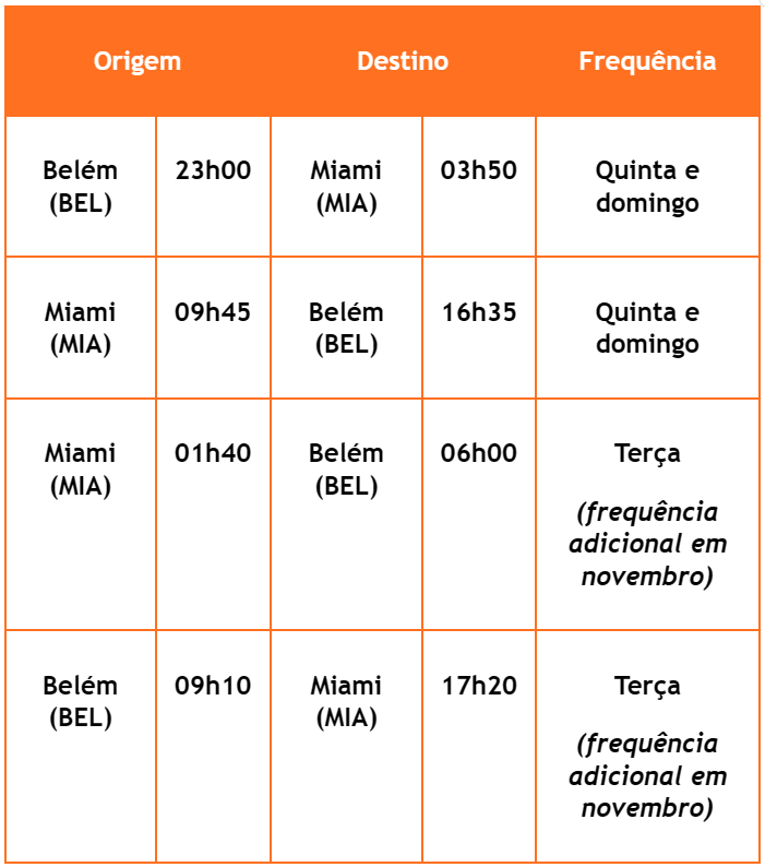 Confira, abaixo, as frequências e os horários dos voos:
